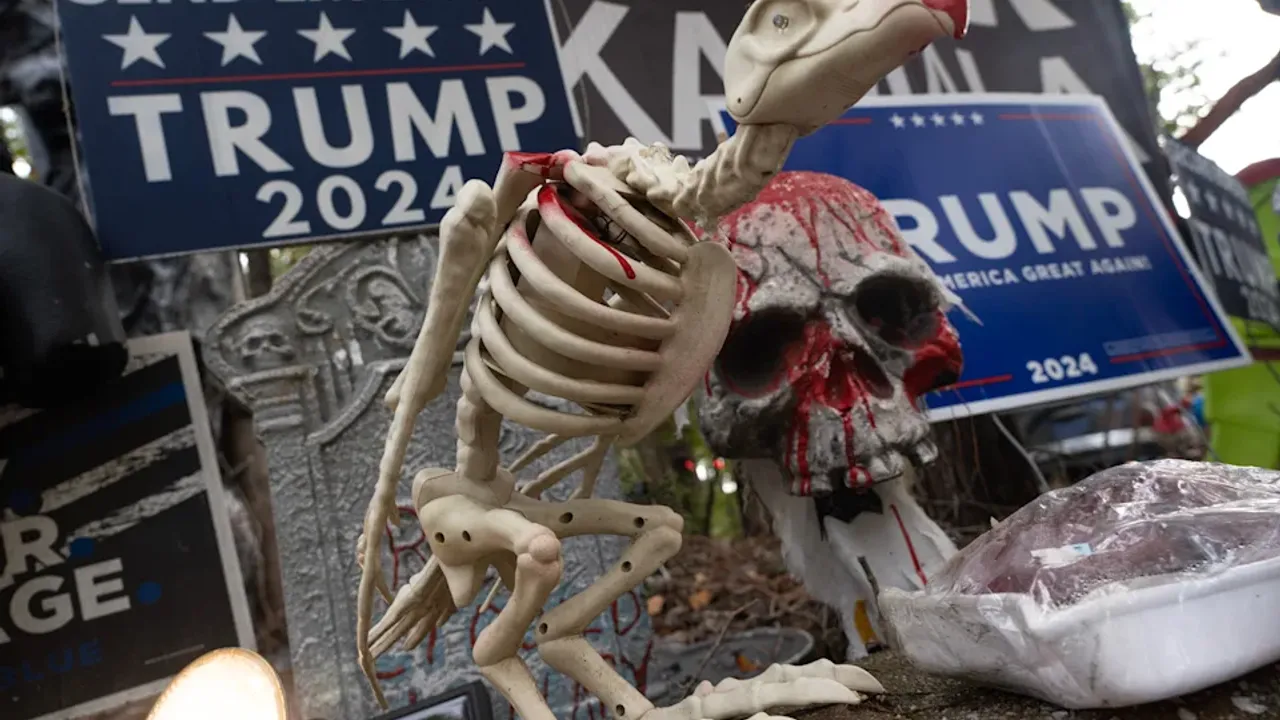 New Jersey eyaletinin Jackson kasabasında bir evin bahçesinde yer alan siyasi temalı Cadılar Bayramı süslemelerinde, Göçmenlik ve Gümrük Muhafaza (ICE) polisi ve gözaltı merkezinde tutulan düzensiz göçmen figürlerine yer verildi.