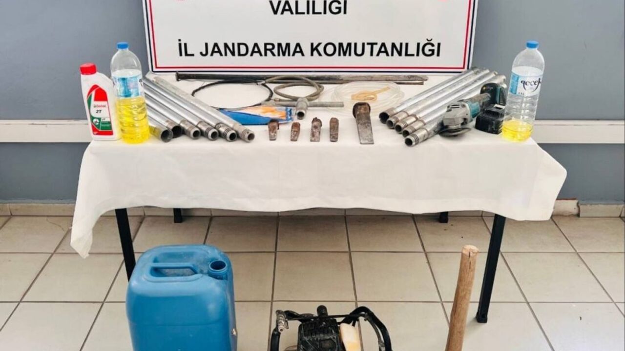 Bölgede kaçak kazıda kullanılan karot ve spiral taşlama makineleri, levye, balyoz ve çeşitli malzemeler ele geçirildi.
