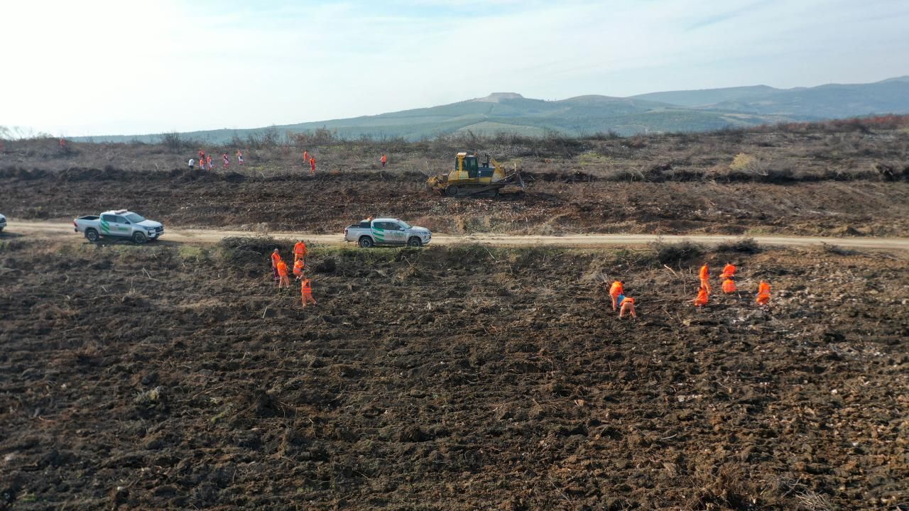 Toprağın üst kısmını temizleyen ekipler, ardından zemini işleyen orman ekipleri, fidanları dikime hazır hale getiriyor.