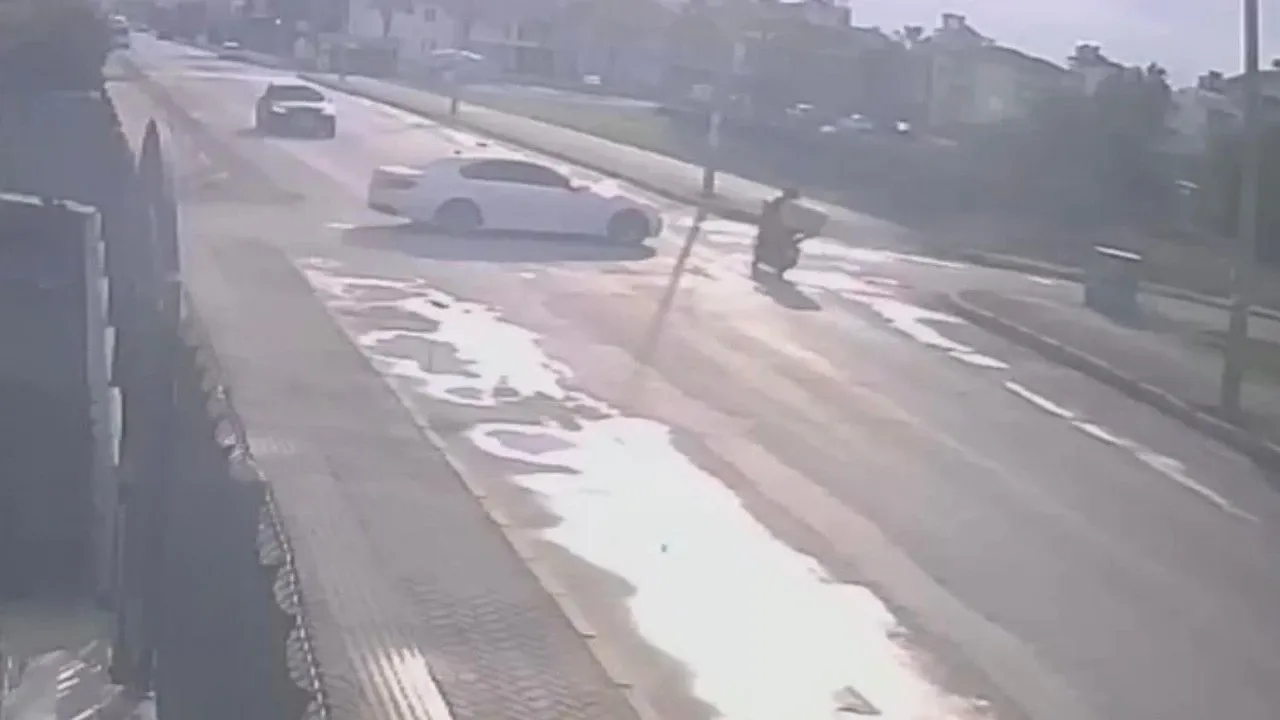 Görüntüde, ana yolda ilerleyen motosiklet ile yan yoldan gelen otomobilin çarpışması ve motosikletlinin savrulması yer alıyor.
