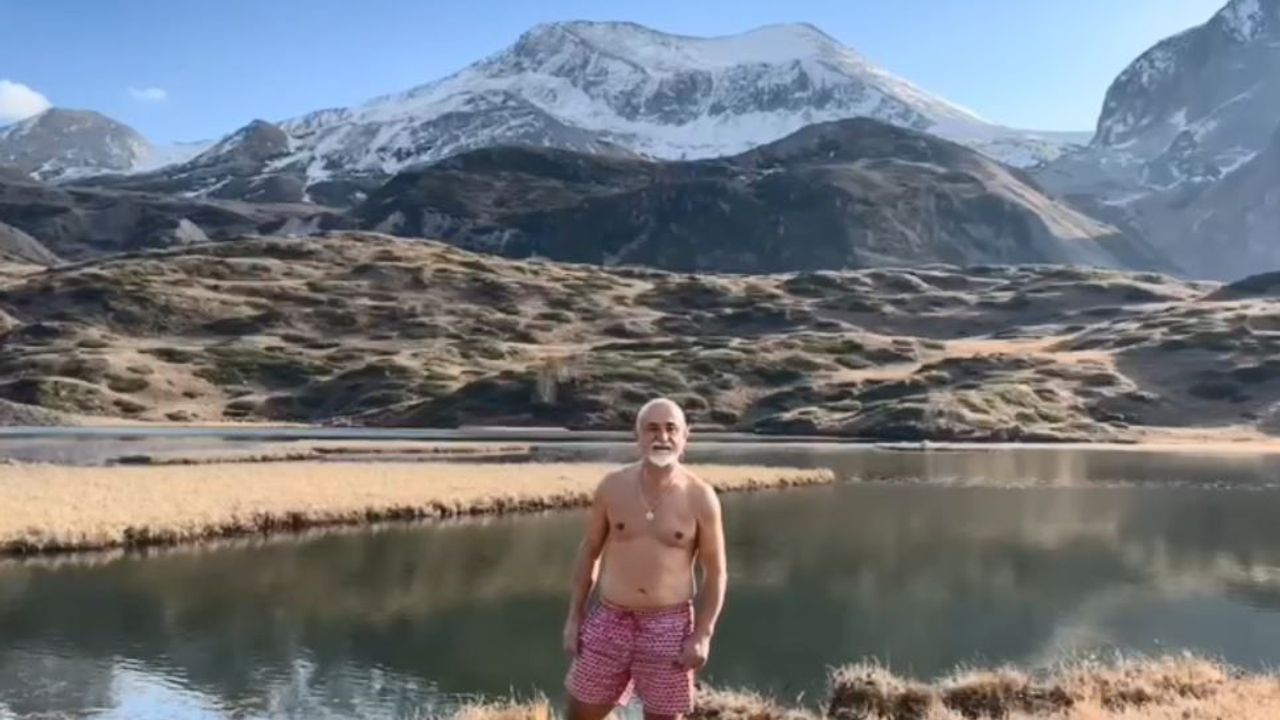 Şavşat’taki Arsiyan Yaylası’nda Giresun Dağcılık Spor Kulübü üyesi Emrullah Ceylan, eksi 2 derece havada Yüzen Adalar Gölü’ne girerek soğuk havaya meydan okudu.