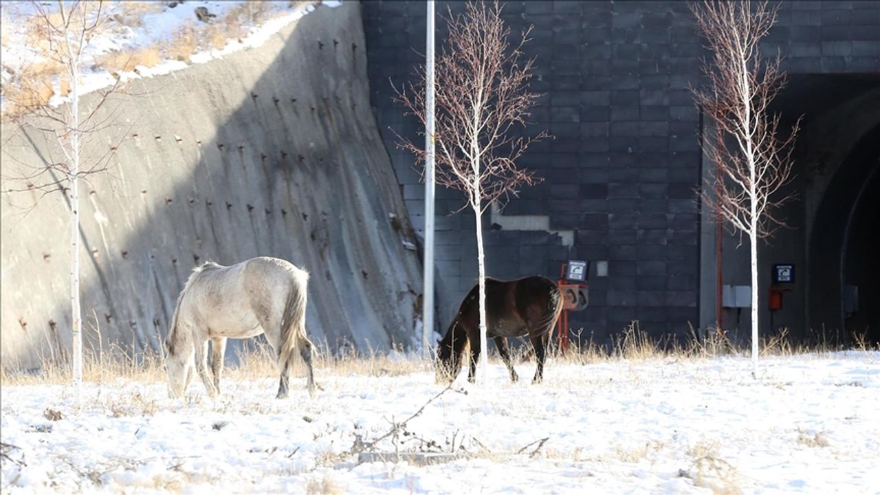 Tünelin Aktaş kavşağı mevkisinde karla kaplı alanda otlamaya çalışan atlar, zaman zaman yol ve kavşak çevresinde dolaşarak ulaşımın kısa süreli aksamasına neden oldu.