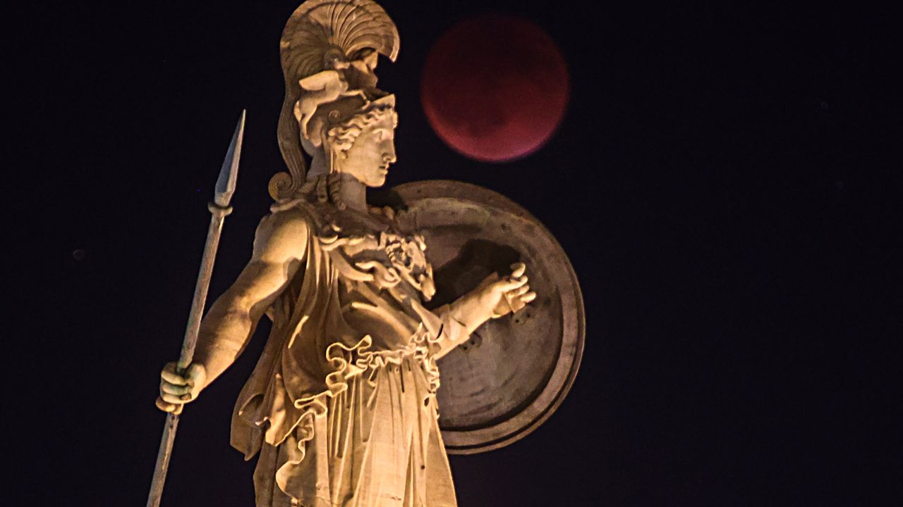 Kırmızı renginden dolayı “Kanlı ay” olarak da bilinen dolunay, tutulma sırasında Yunanistan'ın başkenti Atina'dan görüntülendi.
