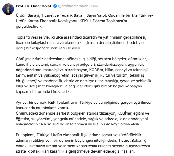 Bakan Bolat, toplantıyı Türkiye–Ürdün ekonomik ilişkilerinde somut ve sürdürülebilir adımların atıldığı yeni bir dönemin başlangıcı olarak nitelendirerek, Türkiye’nin üretim ve ihracat kapasitesini küresel ölçekte güçlendirecek stratejik ortaklıkların kararlılıkla geliştirileceğini belirtti.