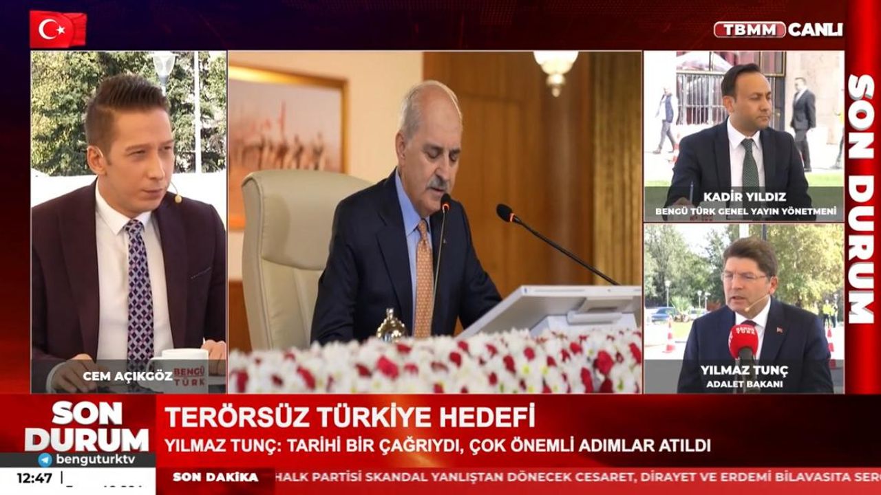 Adalet Bakanı Yılmaz Tunç, Bengü Türk TV’nin TBMM Özel Yayını’na konuk oldu ve gündeme dair önemli değerlendirmelerde bulundu. Terörle mücadeleden yeni yasal düzenlemelere kadar birçok başlığı ele alan Bakan Tunç, Cumhur İttifakı’nın kararlı adımlarıyla Türkiye’nin “terörsüz bir geleceğe” doğru ilerlediğini vurguladı.