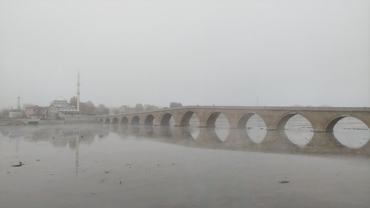Çorum’un Osmancık ilçesinde sabah saatlerinde etkili olan yoğun sis, ilçenin simgesi tarihi Osmancık Kalesi, tarihi köprüde kartpostallık görüntüler oluşturdu.