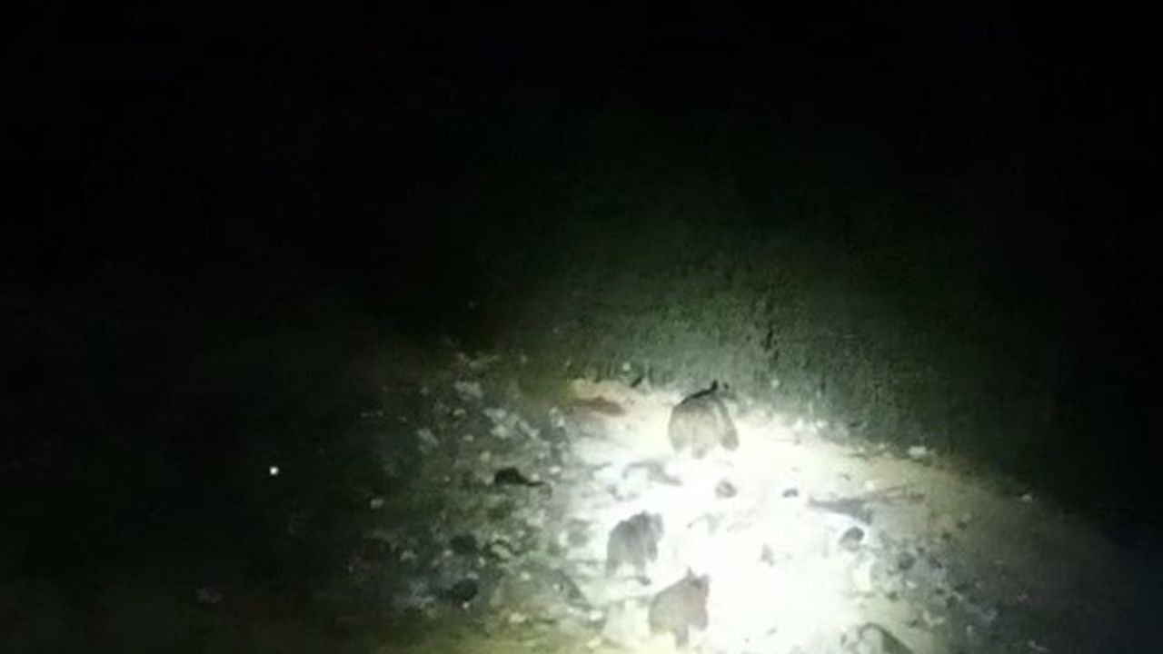 Çukurca ilçesinde yola inen ayı ve yavruları, bölgedeki bir şantiyede çalışan işçiler tarafından cep telefonu kamerasıyla görüntülendi. Şantiye görevlileri, yol kenarına inen ayı ailesini el feneriyle aydınlatarak görüntüledi. Görevliler, ayı ailesiyle yol kenarında sık sık karşılaştıklarını ifade etti.