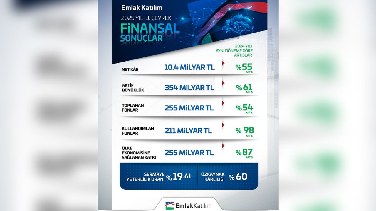 Sürdürülebilir büyüme anlayışıyla faaliyetlerini genişleten Emlak Katılım, 2025 yılının üçüncü çeyreğinde de güçlü finansal performansını sürdürerek büyüme ivmesini korudu. Emlak Katılım, katılım finans ilkeleri doğrultusunda ülke ekonomisine kaynak sağlamayı sürdürürken etkin bilanço yönetimi ve verimlilik odaklı stratejileriyle finansal yapısını daha da güçlendirdi.
