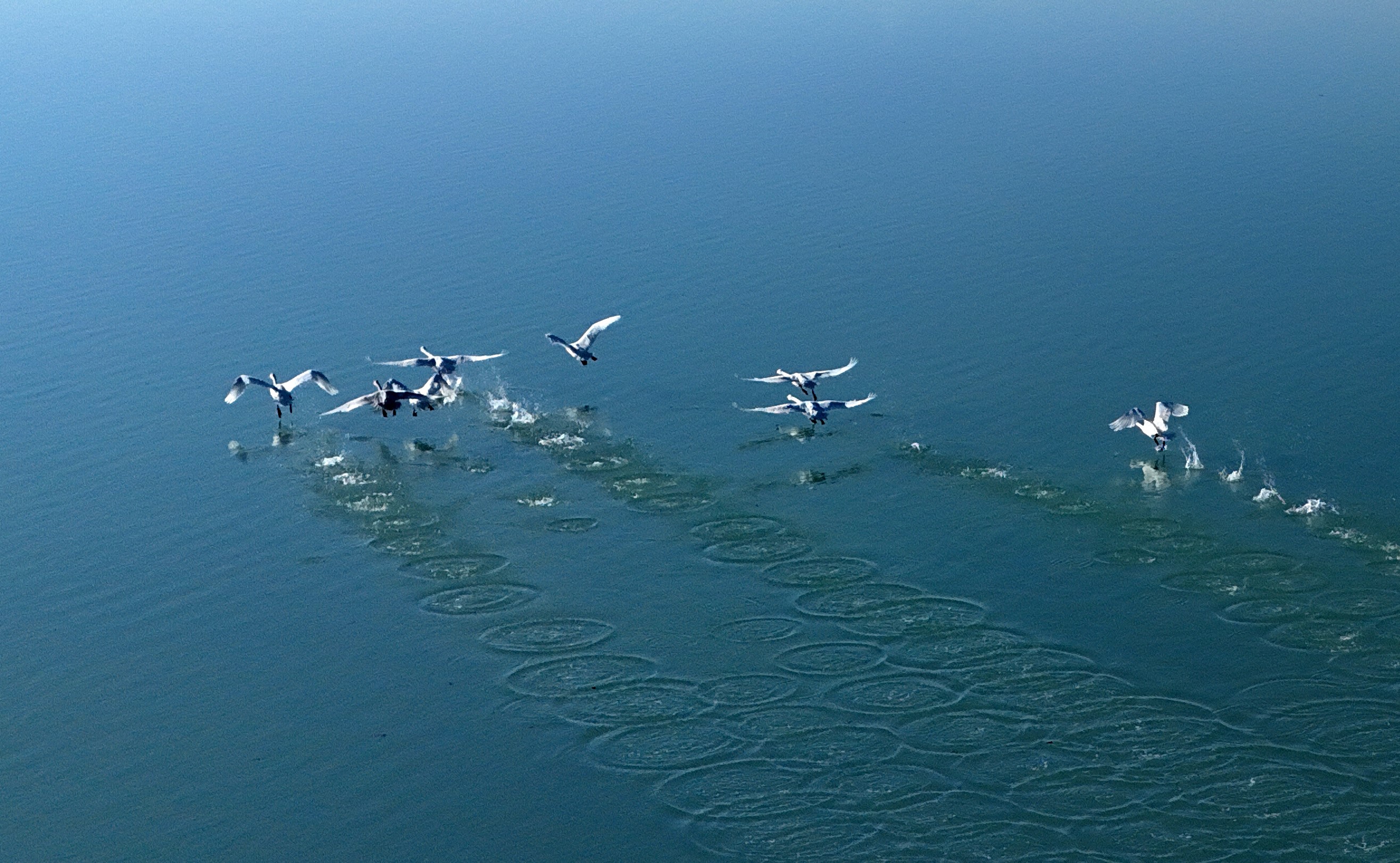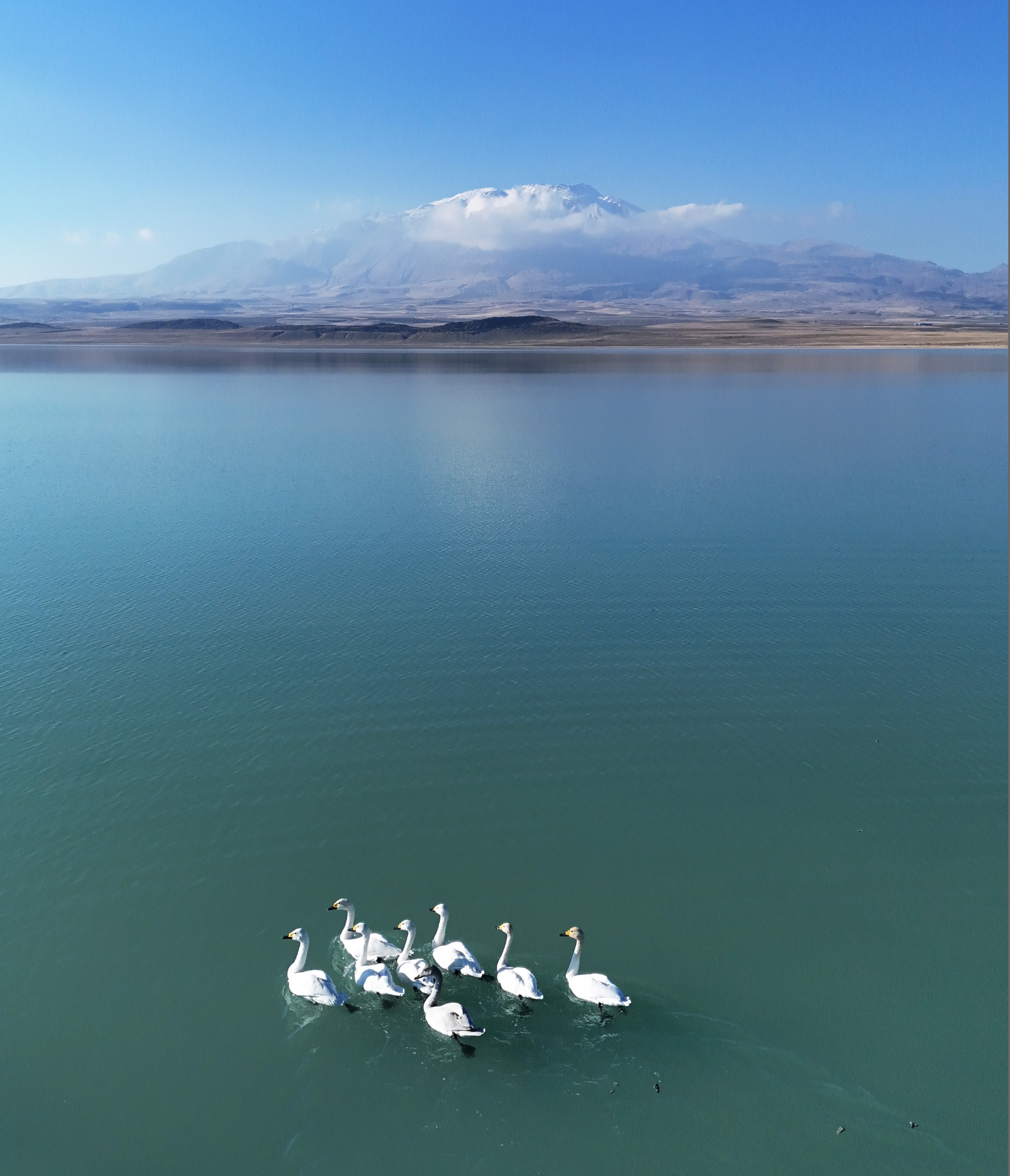 Bu dönemde göle gelen ötücü kuğular, sakin ve etkileyici duruşlarıyla izleyenleri adeta büyülerken, dronla çekilen görüntüler doğanın sunduğu eşsiz güzelliği gözler önüne serdi.
