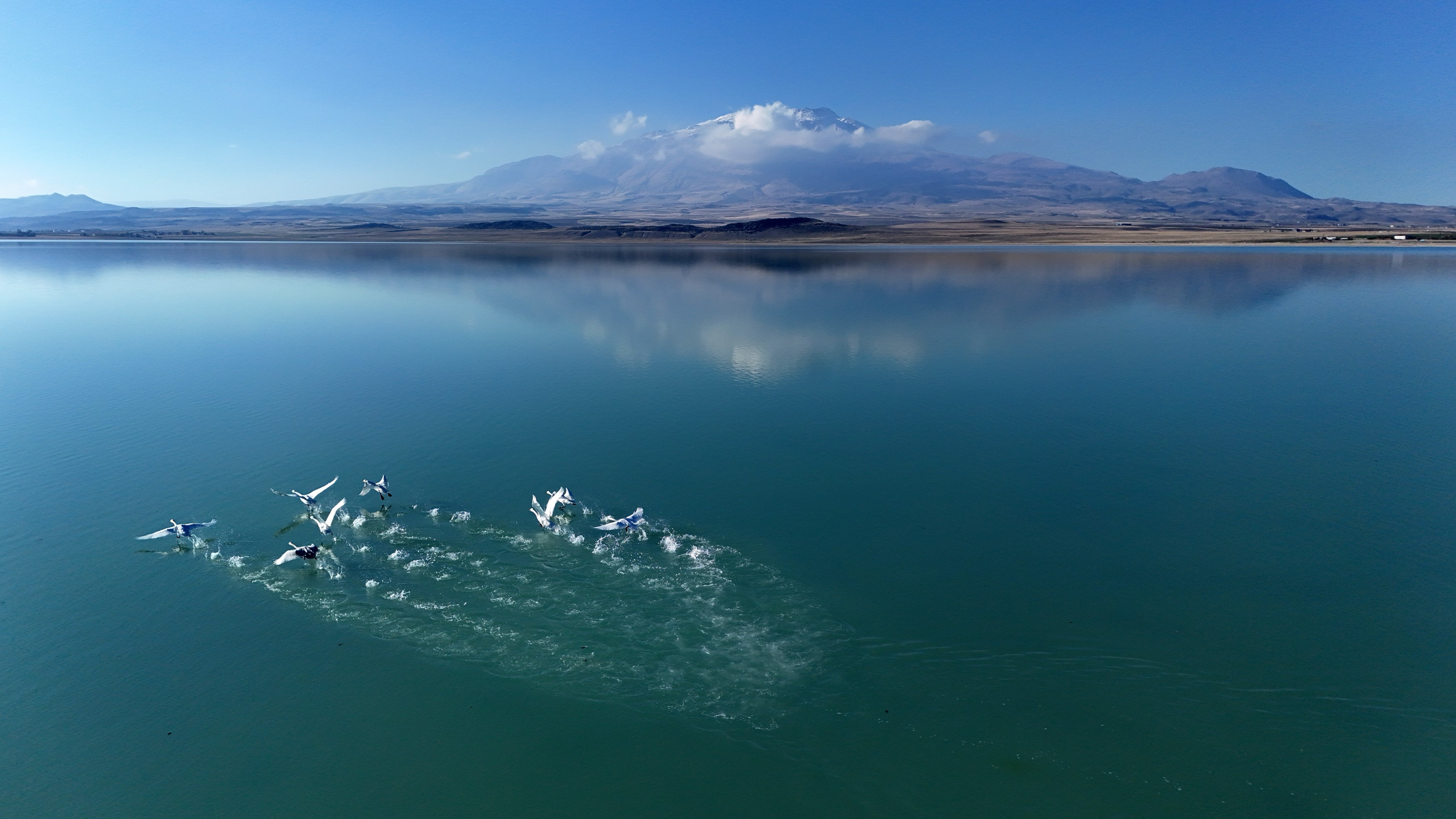 Havadan kaydedilen görüntülerde, Arin Gölü’nün berrak yüzeyinde süzülen kuğuların arka planında yükselen, zirvesi karla kaplı Süphan Dağı dikkat çekti.