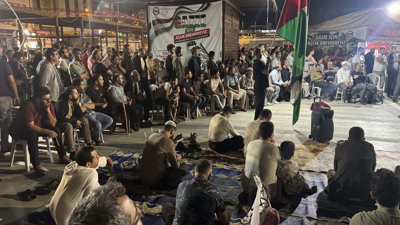 Kent merkezindeki bir alışveriş merkezinin önündeki alanda toplanan vatandaşlar, İsrail'in Küresel Sumud Filosu'na yönelik saldırısını protesto etti.