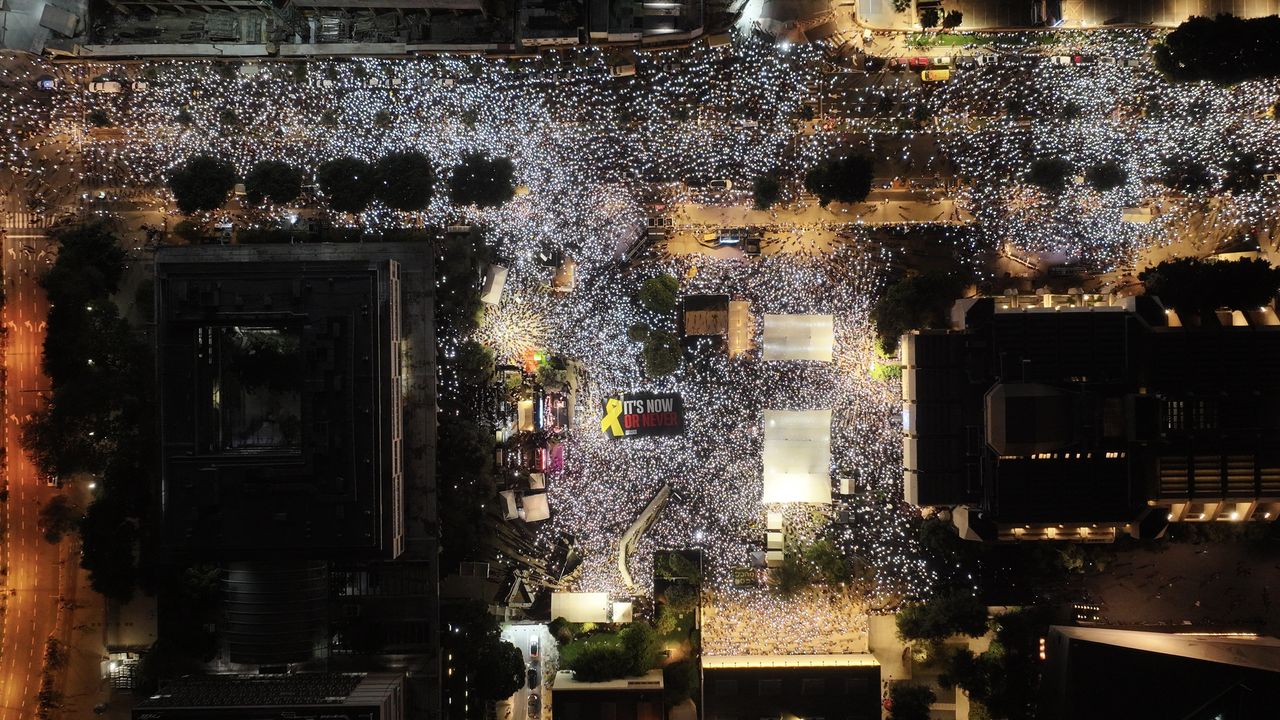 Göstericiler, üzerinde “Başkan Trump, savaşı bitir ve rehinleri kurtar” yazılı pankartlar açtı.