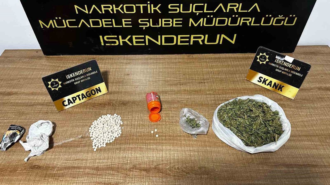 İl Emniyet Müdürlüğü görevlilerince uyuşturucu imal ve ticaretine yönelik çalışmalarını sürdürüyor. İskenderun ilçesinde A.Y. isimli şahsın Meydan Mahallesindeki konteynerinde yapılan aramada;2 parça halinde daralı 34 gram uyuşturucu metamfetamin maddesi, M.O. isimli şahsın Moderen Evler mahallesindeki ikametinde ve aracındaki aramada; 2 parça halinde daralı 185 gram Esrar, 283 Adet Captagon ele geçirildi.