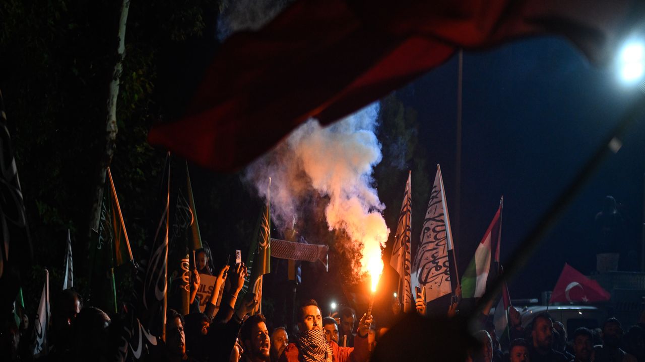 "İnsanlığın onuru Sumud Filosu", "Kudüs bizimdir, bizim kalacak", "Katil İsrail, işbirlikçi ABD" ve "İşte burası katillerin yuvası" sloganları atan gruptakiler, "Hamas seninleyiz" yazılı pankart açtı.