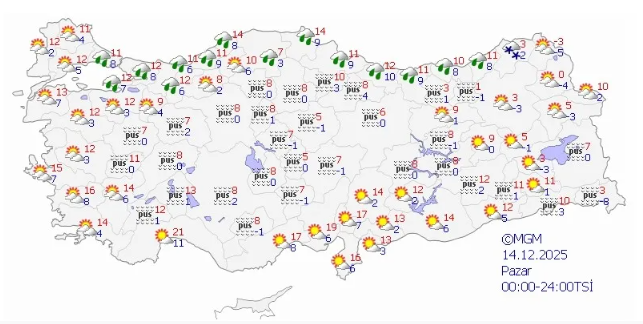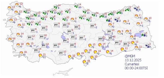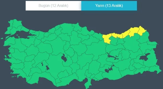 Öte yandan 13 Aralık Salı günü için 5 ilimize sarı kodlu uyarı yapıldı.