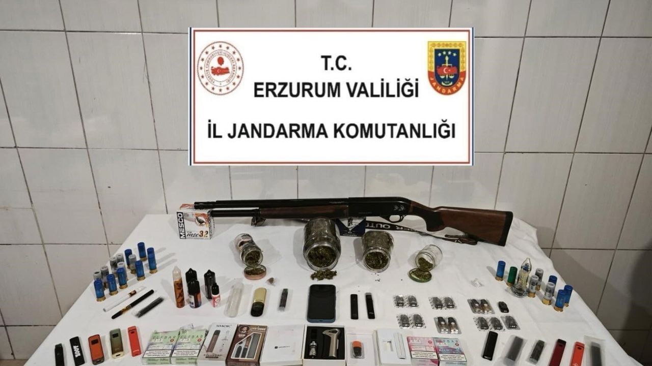 Erzurum Cumhuriyet Başsavcılığı koordinesinde Pazaryolu ilçesinde gerçekleştirilen operasyonda; 167 gram kubar esrar, 8 gram kokain, 1 adet uyuşturucu kullanma aparatı, 12 adet uyuşturucu madde kullanıldığı değerlendirilen boş likit şişesi, 1 adet ruhsatsız av tüfeği, 67 adet 12 cal. av tüfeği fişeği, 29 adet kaçak elektronik sigara cihazı, 19 adet kaçak elektronik sigara cihazı başlığı ve 1 adet suçta kullanıldığı değerlendirilen cep ele geçirildi.