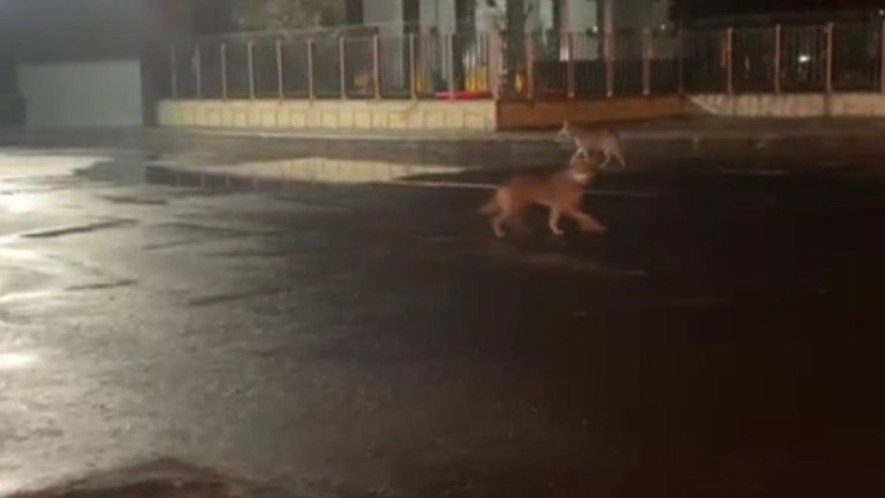 İl Emniyet Müdürlüğü civarında yiyecek arayan iki kurt, cep telefonu kamerasına yansıdı.