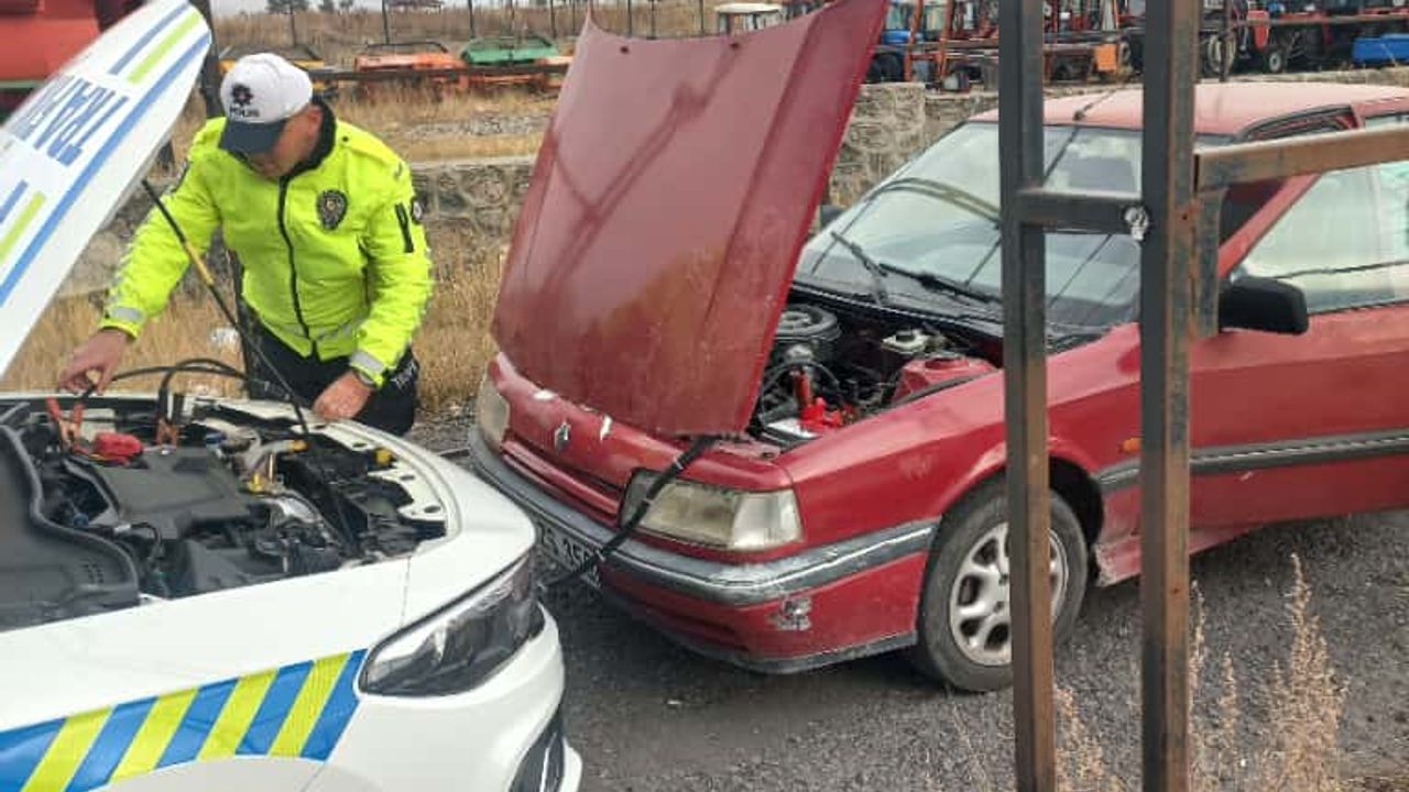 Ekipler, polis otosunu arızalanan araca yaklaştırarak kendi ekip aracından akü takviyesi yaptı.