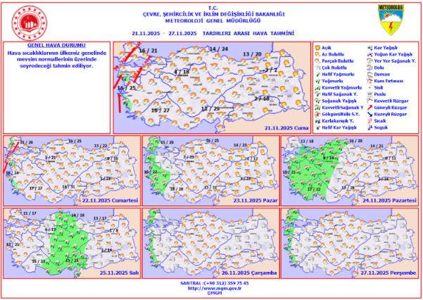 Hafta sonu beklenen günün en yüksek sıcaklık değerleri Ankara'da 21, Samsun'da 25, İzmir'de 24, Antalya'da 28, Adana'da 31, Diyarbakır'da 19, Erzurum'da 12 derece civarında seyredecek.