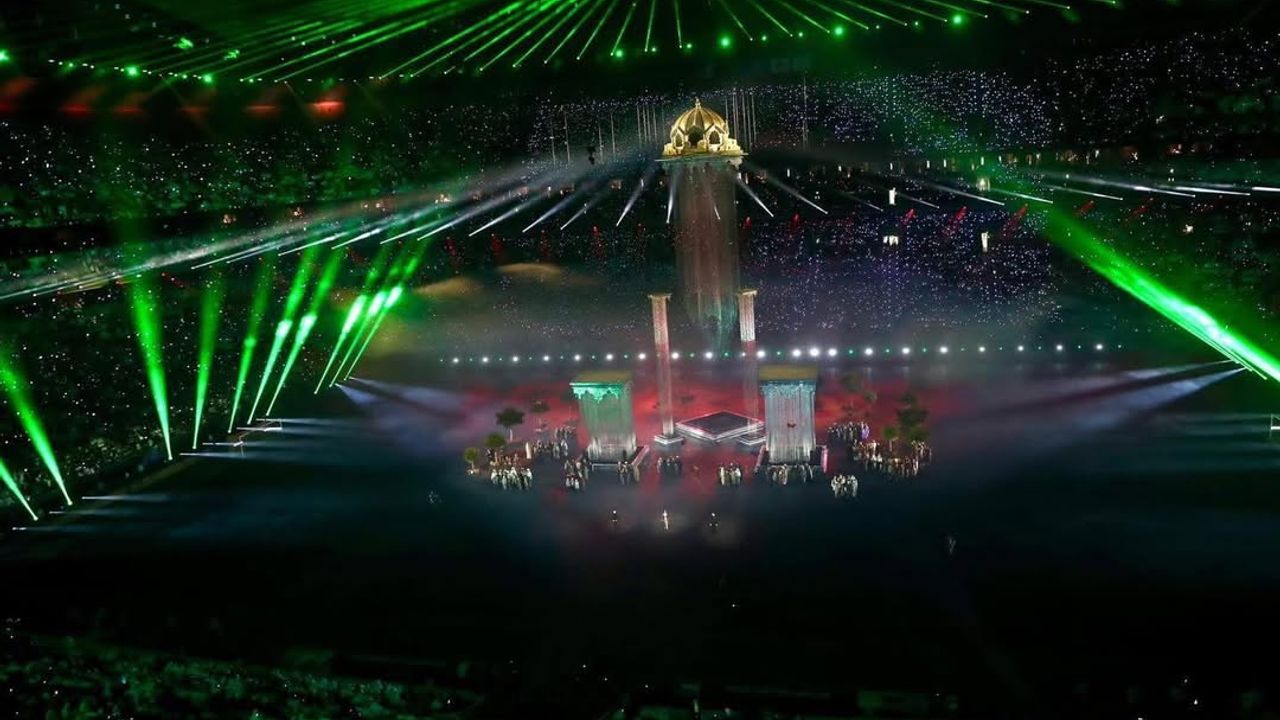 Törenin anlatıcılığını üstlenen Suriyeli sanatçı Raşid Assaf, Filistin davasının tarihsel seyrini Arap futbolunun coşkusuyla harmanlayan etkileyici bir sunum gerçekleştirdi.