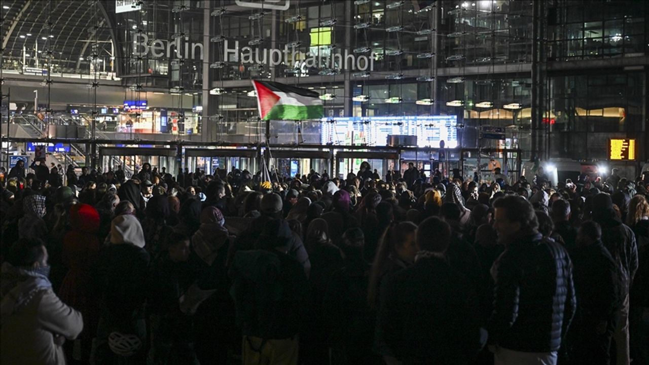 ANKARA(AA)-Berlin ana tren istasyonunda toplanan yaklaşık 300 kişi, Küresel Sumud Filosu ile dayanışma mesajları verdi.