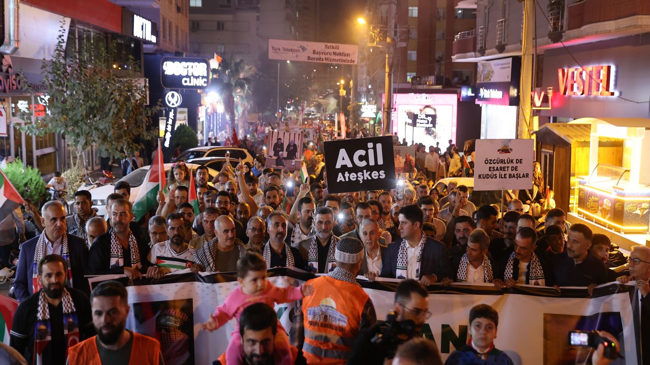 Mardin Sivil Toplum Kuruluşları Platformu öncülüğünde Artuklu Fuar Alanı'nda bir araya gelen katılımcılar, ellerinde Türk ve Filistin bayraklarıyla tekbir getirdi, İsrail karşıtı sloganlar attı.