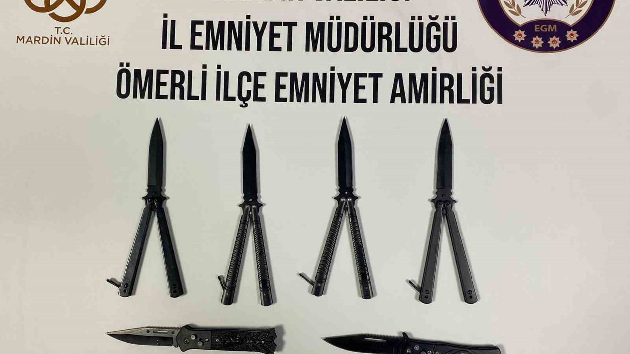 İl Emniyet Müdürlüğünden yapılan açıklamada, Ömerli İlçe Emniyet Amirliği ekiplerince ilçe genelinde düzenlenen uygulamalarda, seyyar satış yapan bir kişinin sattığı ürünler arasında 4 adet kelebek ve 3 adet sustalı bıçak bulundu. Bıçaklara el konulurken şahıs hakkında, 6136 sayılı kanun kapsamında adli işlem başlatıldı.