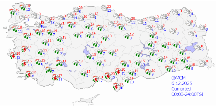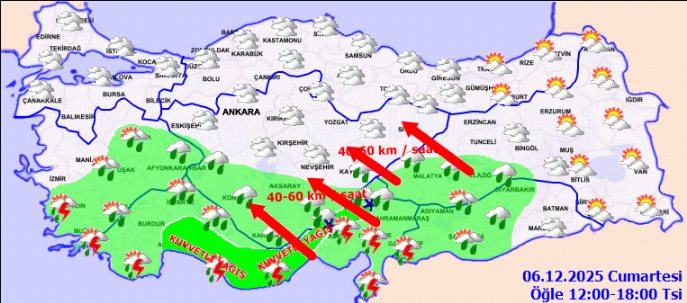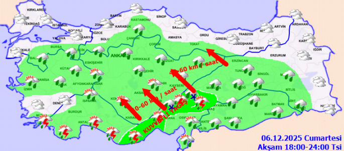 Batı Akdeniz’de rüzgarın, yarın (05.12.2025) sabah saatlerinden itibaren doğu ve güneydoğudan 6 ila 8 kuvvetinde (50-75 km/saat) fırtına, yer yer 9 kuvvetinde (90 km/saat) kuvvetli fırtına şeklinde eseceği tahmin edilmektedir. Fırtınanın Cumartesi (06.12.2025) günü akşam saatlerinden itibaren etkisini kaybetmesi beklenmektedir.