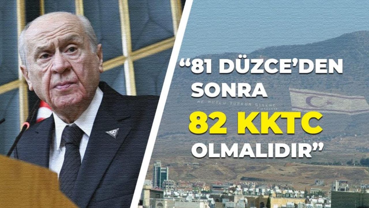 MHP Lideri Devlet Bahçeli, daha önce “O zaman geldiğinde, şartlar oluştuğunda, tarih coğrafyaya dar geldiğinde Misak-ı Milli uyanacak; 81 Düzce’den hemen sonra 82 Kerkük, 83 Musul deme hakkının önünde hiçbir güç duramayacaktır.” ifadeleriyle hatırlanan sözlerini revize ederek, “81 Düzce, 82 KKTC olması hayat memat konusu haline gelmiştir.” dedi.