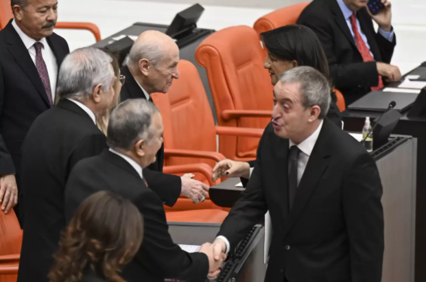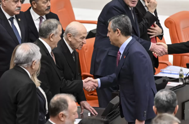 MHP Genel Başkanı Devlet Bahçeli ile CHP Genel Başkanı Özgür Özel selamlaştı.
