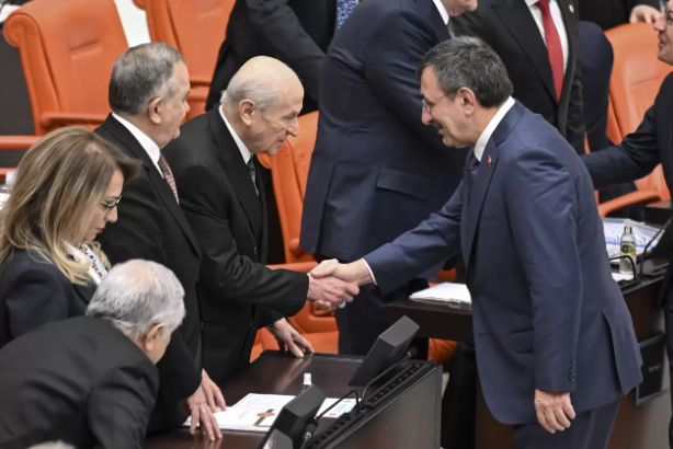 MHP Genel Başkanı Devlet Bahçeli ile Cumhurbaşkanı Yardımcısı Cevdet Yılmaz, selamlaştı.