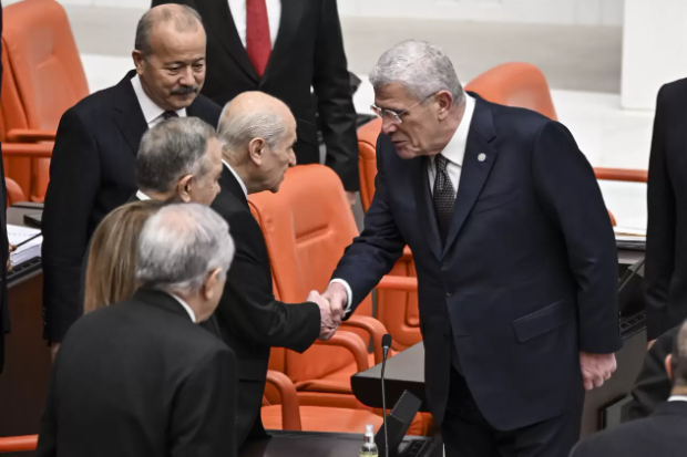 MHP Genel Başkanı Devlet Bahçeli ile İP'li Müsavat Dervişoğlu selamlaştı.
