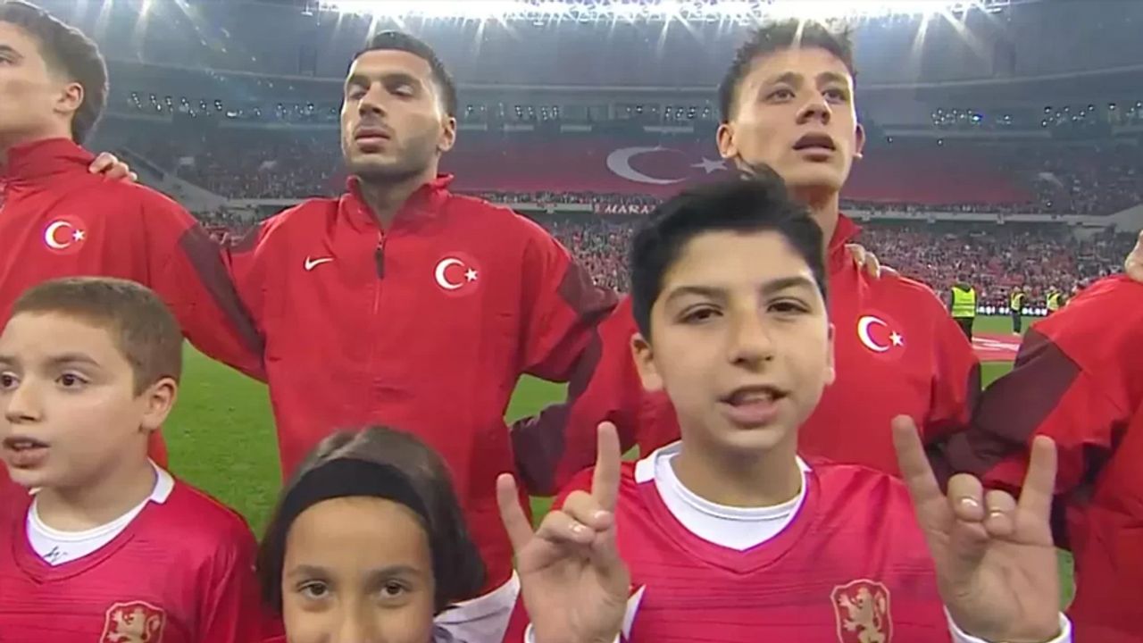 İstiklal Marşı sırasında milli oyuncuların önünde yer alan seremoni çocuklarının ‘kurt’ işareti yapması, tribünler ve yayın ekranlarında ilgi çekti.