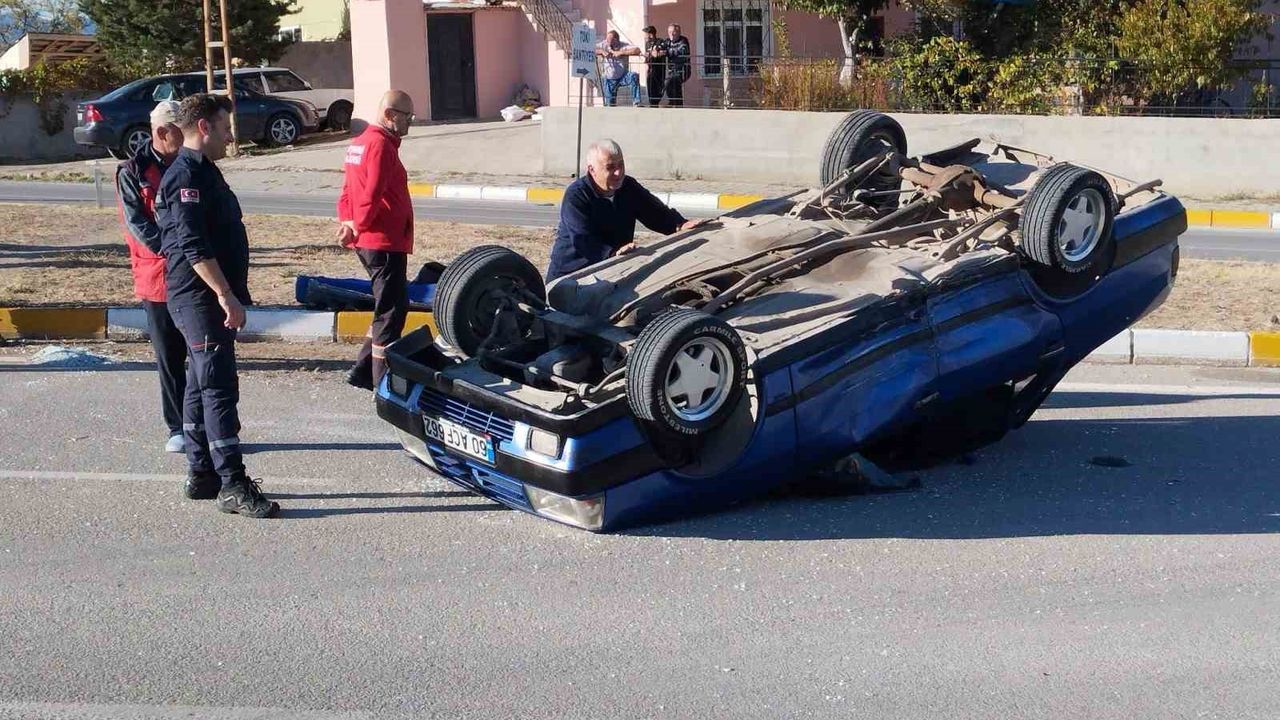 SİVAS(İHA)-Kaza, Suşehri ilçesi Ekrem Erdem Bulvarında meydana geldi. Edinilen bilgilere göre, M.K yönetimindeki plakası öğrenilemeyen otomobil ile V.M. yönetimindeki 60 AFC 662 plakalı otomobil çarpıştı. Sürücüsünün kontrolünden çıkan 60 AFC 662 plakalı Tofaş marka otomobil takla atarak ters döndü. Ters dönen otomobil içerisinde bulunan iki kişi, kazada şans eseri yara almadı. Polis ekipleri kaza ile ilgili inceleme başlattı.