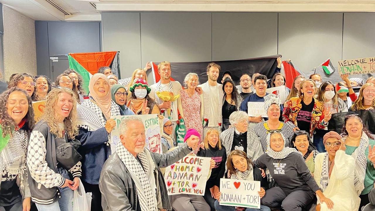 Havalimanının dış hatlar terminalinin çıkış kapısında "Özgür Filistin" sloganları eşliğinde karşılanan iki kardeş, dakikalarca sevgi gösterileri eşliğinde ailesi ve yakınlarıyla kucaklaştı.