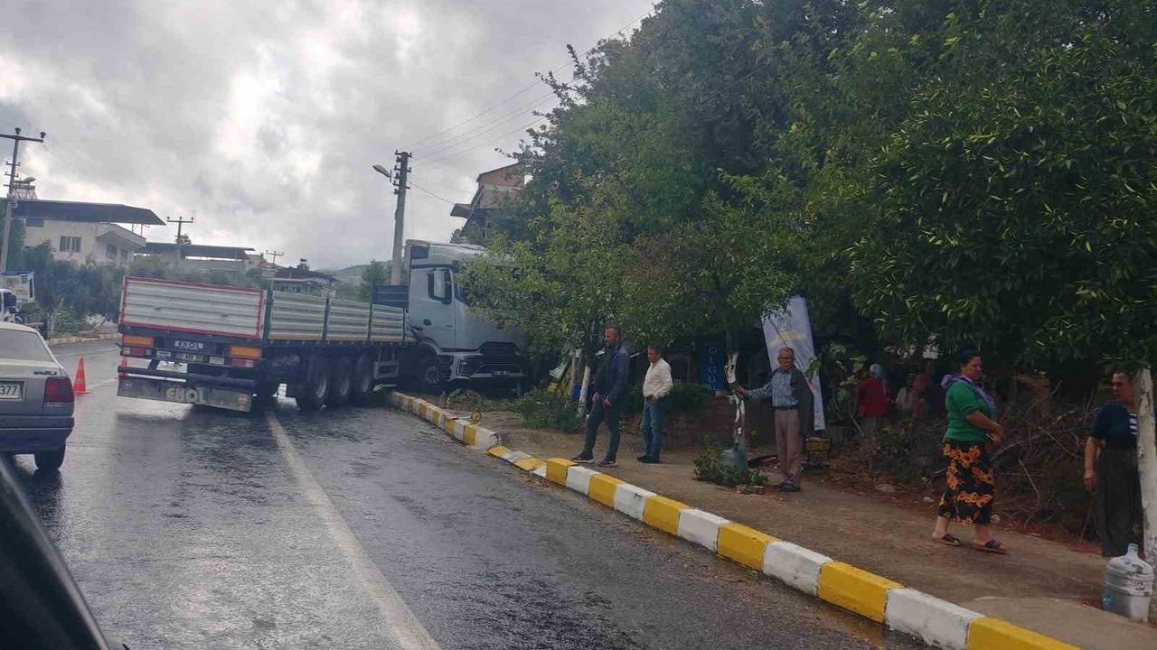 Aydın’ın Bozdoğan ilçesinde meydana gelen trafik kazasında sürücüsünün direksiyon hakimiyetini kaybettiği tır yoldan çıkarak kaldırıma çıkıp ağaçları devirdi.