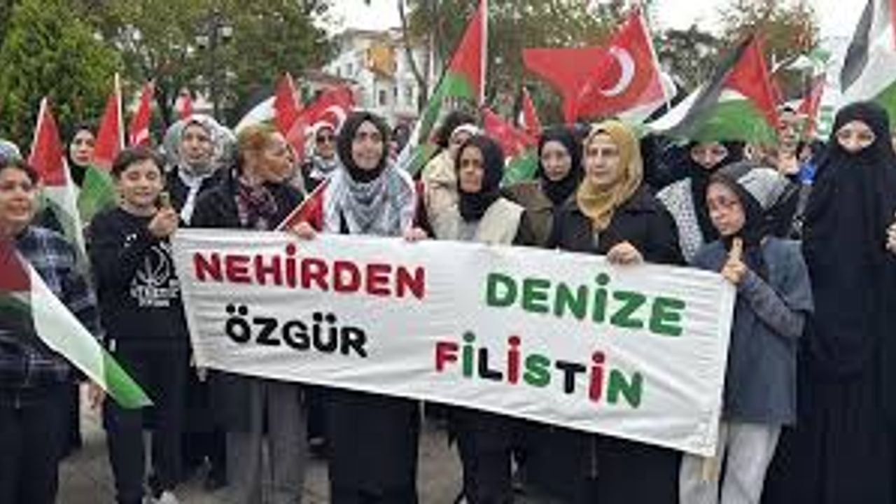 (AA) -Çorlu Şehitliği önünde toplanan grup, Omurtak Caddesi'nden ellerinde Türk ve Filistin bayraklarıyla sloganlar eşliğinde Cumhuriyet Meydanı'na geldi.
