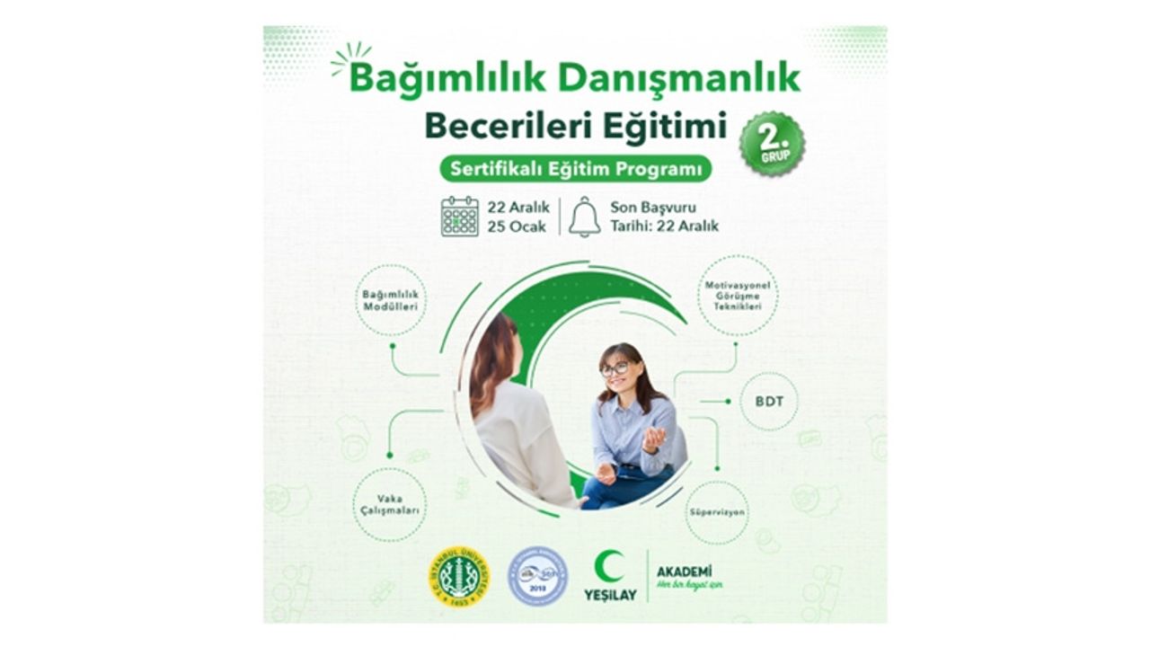 Yeşilay Akademi ile İstanbul Üniversitesi Sürekli Eğitim Uygulama ve Araştırma Merkezi (İstanbul-SEM) işbirliğinde düzenlenen Bağımlılık Danışmanlık Becerileri Eğitimi Sertifika Programı’nın ikinci grubu için başvurular alınmaya başlandı.